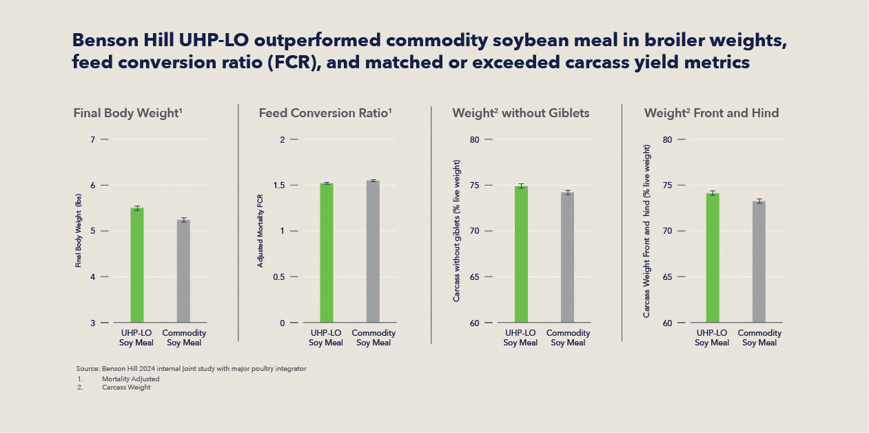 Soybean meal derived from Benson Hill Ultra-High Protein, Low Oligosaccharide (UHP-LO) soybeans outperformed commodity soybean meal in final broiler weights, feed conversion ratio, and other yield metrics.