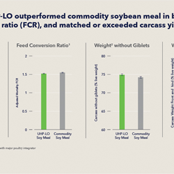 Replacing commodity soybean meal with UHP-LO soybean meal in poultry diets improved broiler weights by 5.4 percent and feed conversion ratios by 3.2 percent.